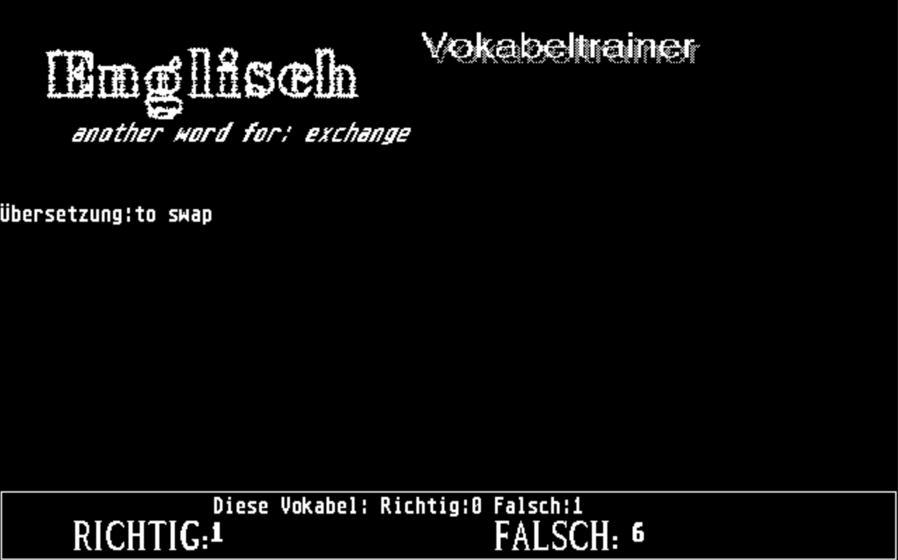 I was too cheap to buy a public domain disk with a vocabulary trainer, so I programmed my own one. This is a very simple program and never developed to be used by anyone except me. Some of my old vocabulary files are included as well.