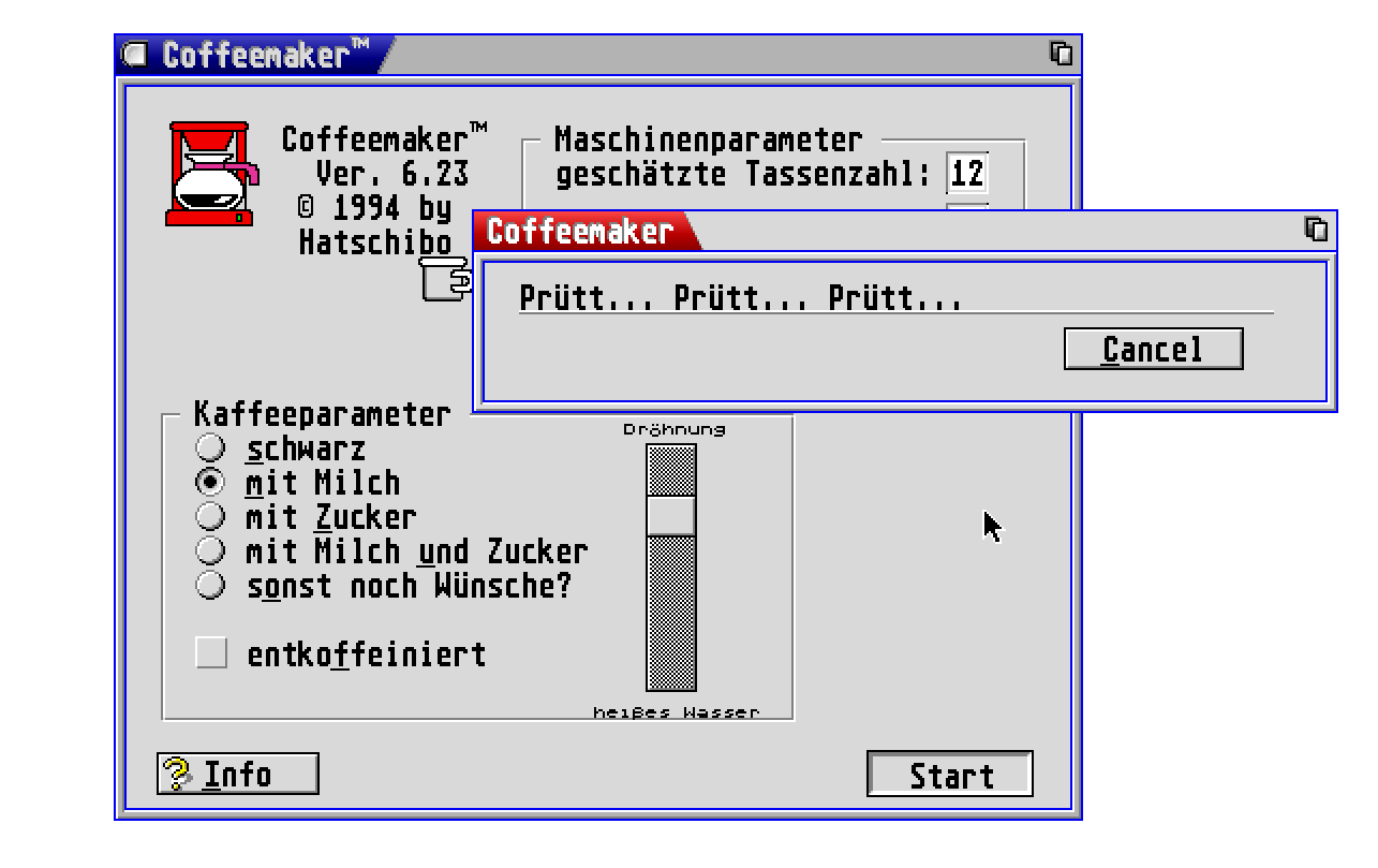 Coffee maker for Atari computers and the Firebee. Version 6.24 adds English localization and is compiled with GBE for better compatibility. With GEMJing support!