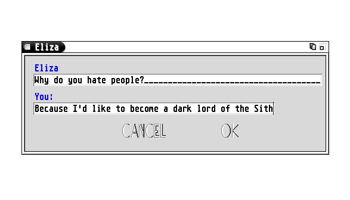 Talk to the computer psychologist Eliza! Finally this program is available in a GEM interface! Version 1.5 - The computer psychologist now can understand some simple GEMScript commands. The color icons are displayed on all systems, BubbleGEM is supported.