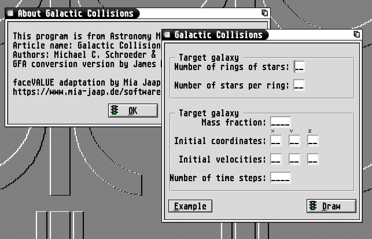This program is originally from Astronomy Magazine December 1988, written by Michael C. Schroeder and Neil Comins. The GFA conversion was done by James Kajpust. I took that version and gave it a faceVALUE update - unfortunately the source is lost.