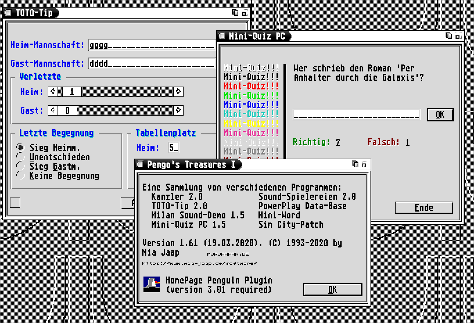 A collection of different programs, partly modernizations of previously unreleased programs. Of the seven programs only the TOTO tip is useful, otherwise there are mini databases (Mini Word, PowerPlay Data-Base), beeps (Milan Sound-Demo, Sound Toys), a fun program (Kohl-Emulator) and a small game (Mini-Quiz PC). The Treasures are bilingual and support GEMScript.
